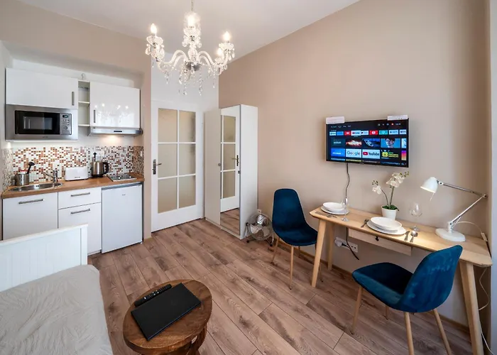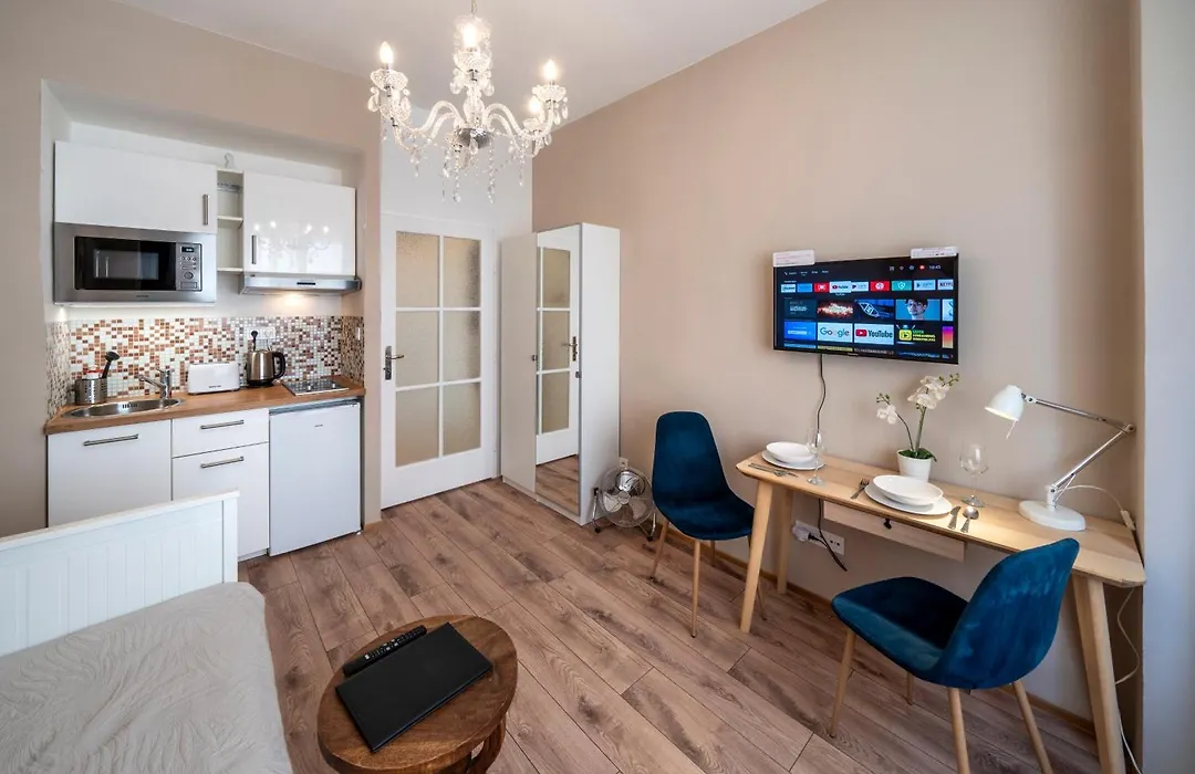 Gasten kunnen gebruik maken van een kitchenette met een magnetron, een waterkoker en een koelkast, eveneens koffie- en theevoorzieningen beschikbaar op locatie. De 1-badkamer accommodatie is te bereiken op een paar stappen verwijderd van Svandovo divadlo bushalte.